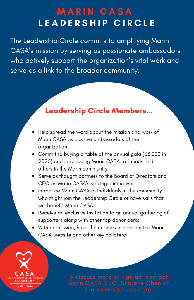 Leadership Circle members donate annually by buying a table at our annual gala ($3,000 in 2025) and introducing Marin CASA to friends and contacts. More details below. Email Marin CASA CEO, Sherene Chen to learn more.